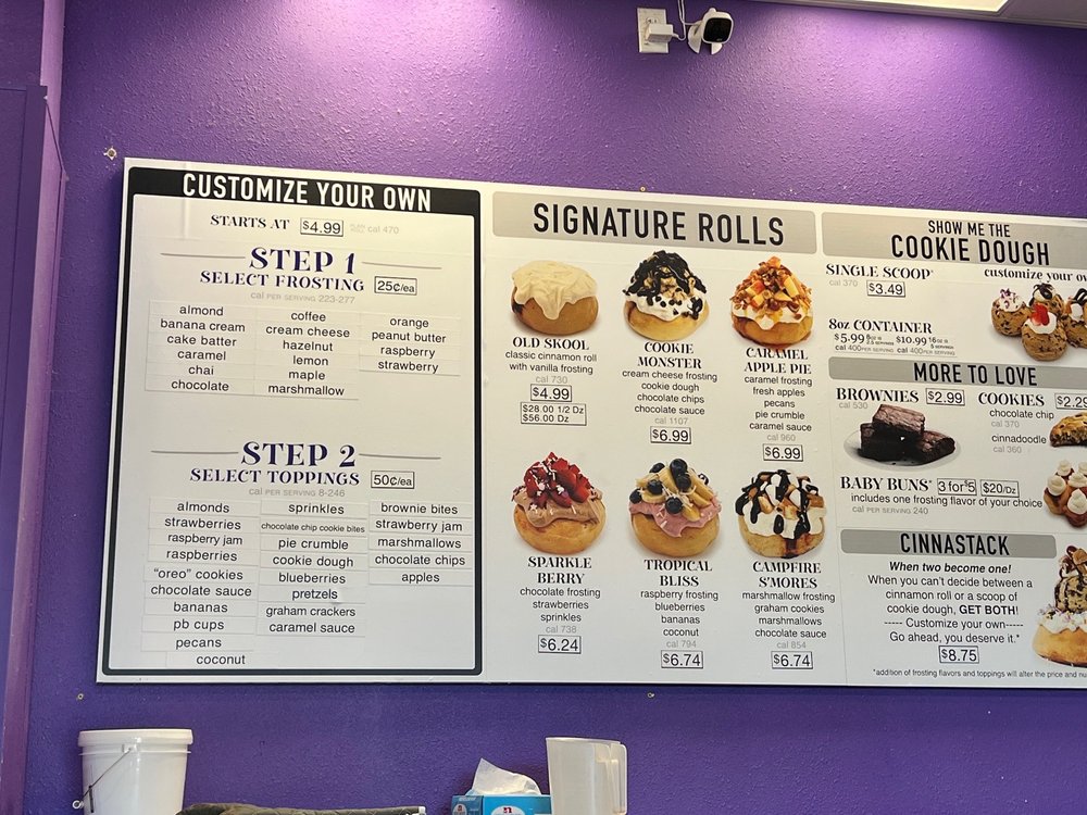 “ OH My Gosh! This place smells so good when you walk in. Its a little place tonsil and eat your cinnamon rolls. Very attentive staff I barely opened the door and they welcomed me. This was my 1st time, so I went with Cookie Monster a very berry. These are addictive very decadent. Its 8.50 a roll, which is pretty good. ”